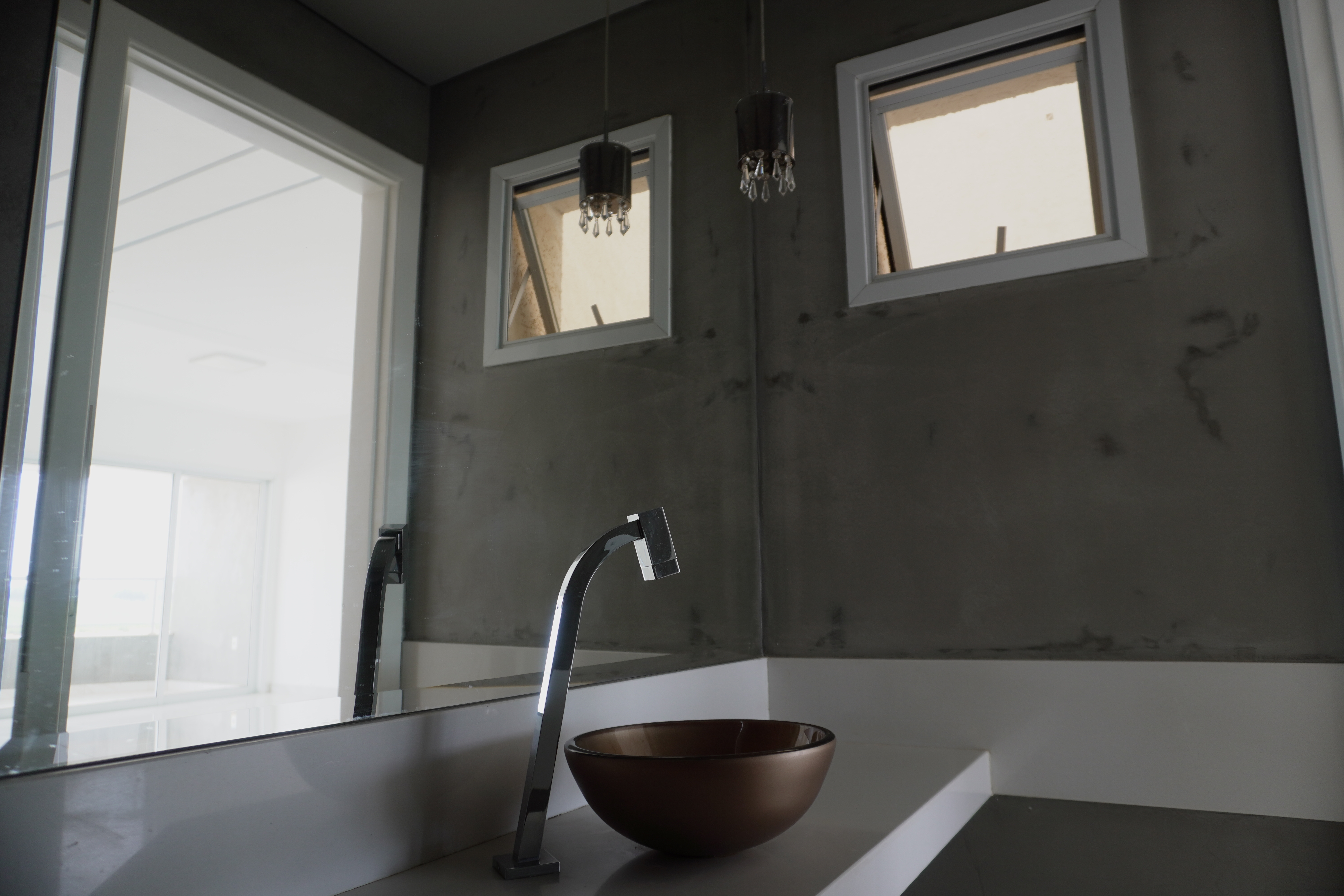 - lavabo decorado com cuba de vidro, espelho e lustre já instalados;