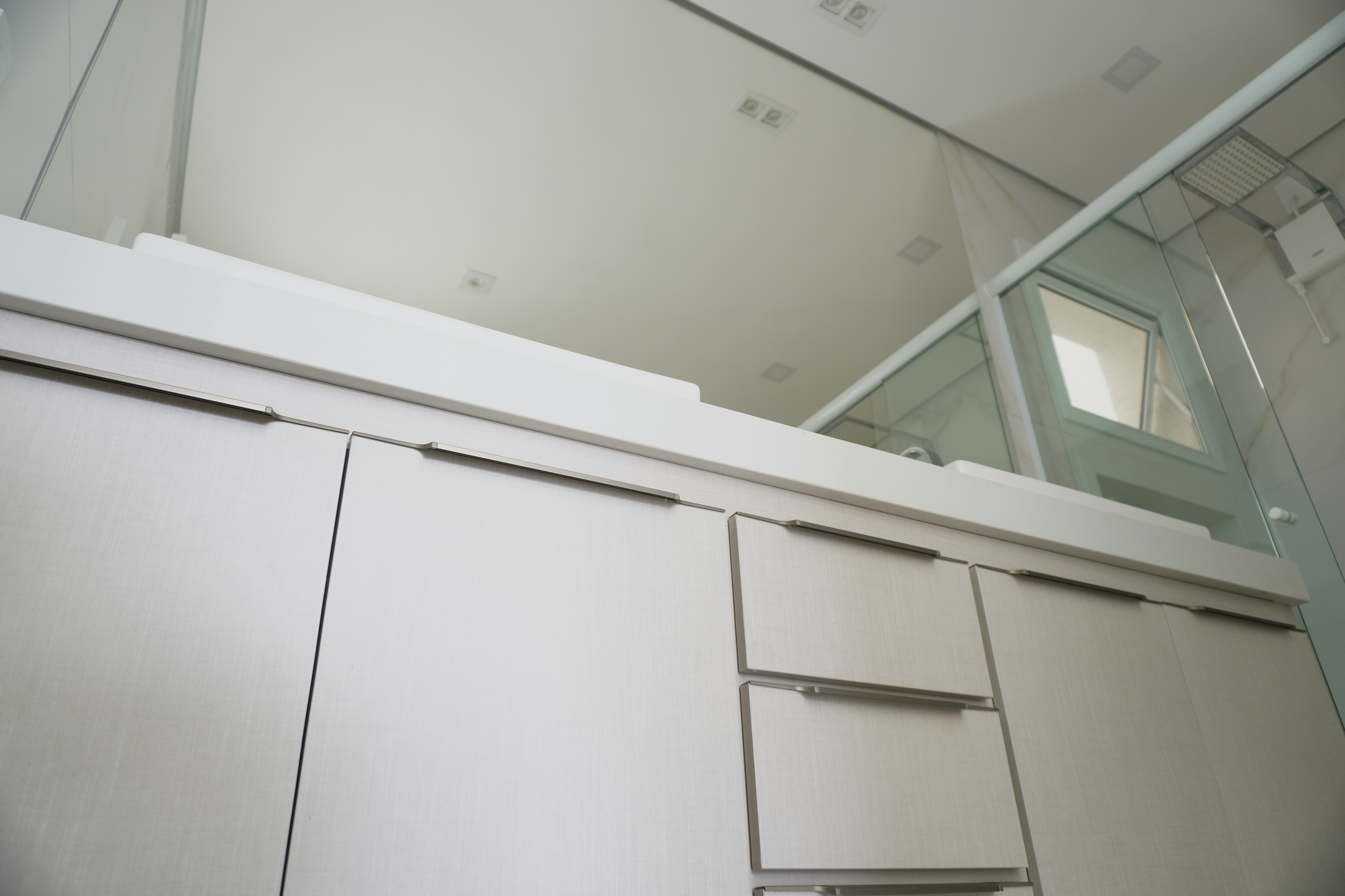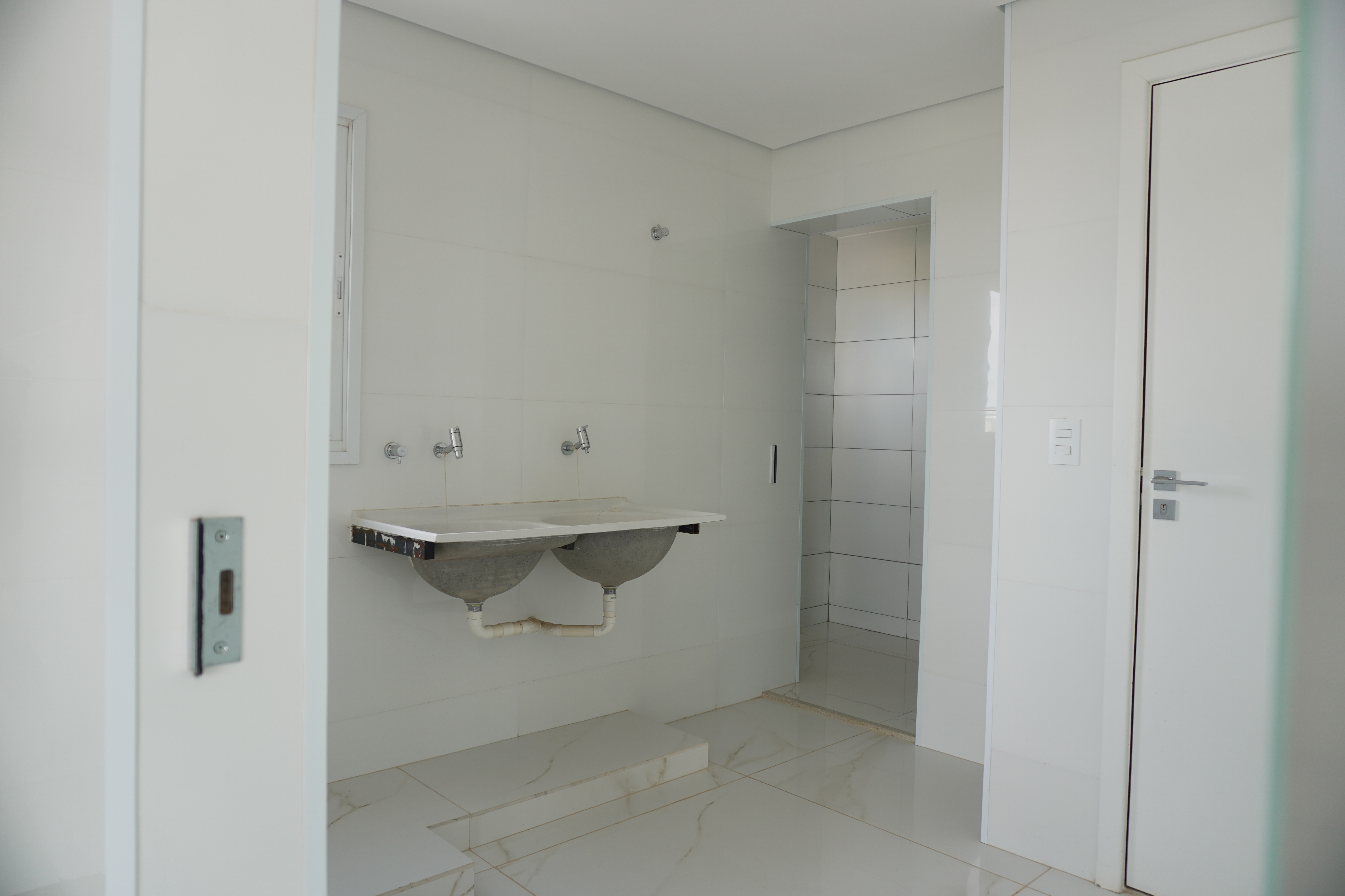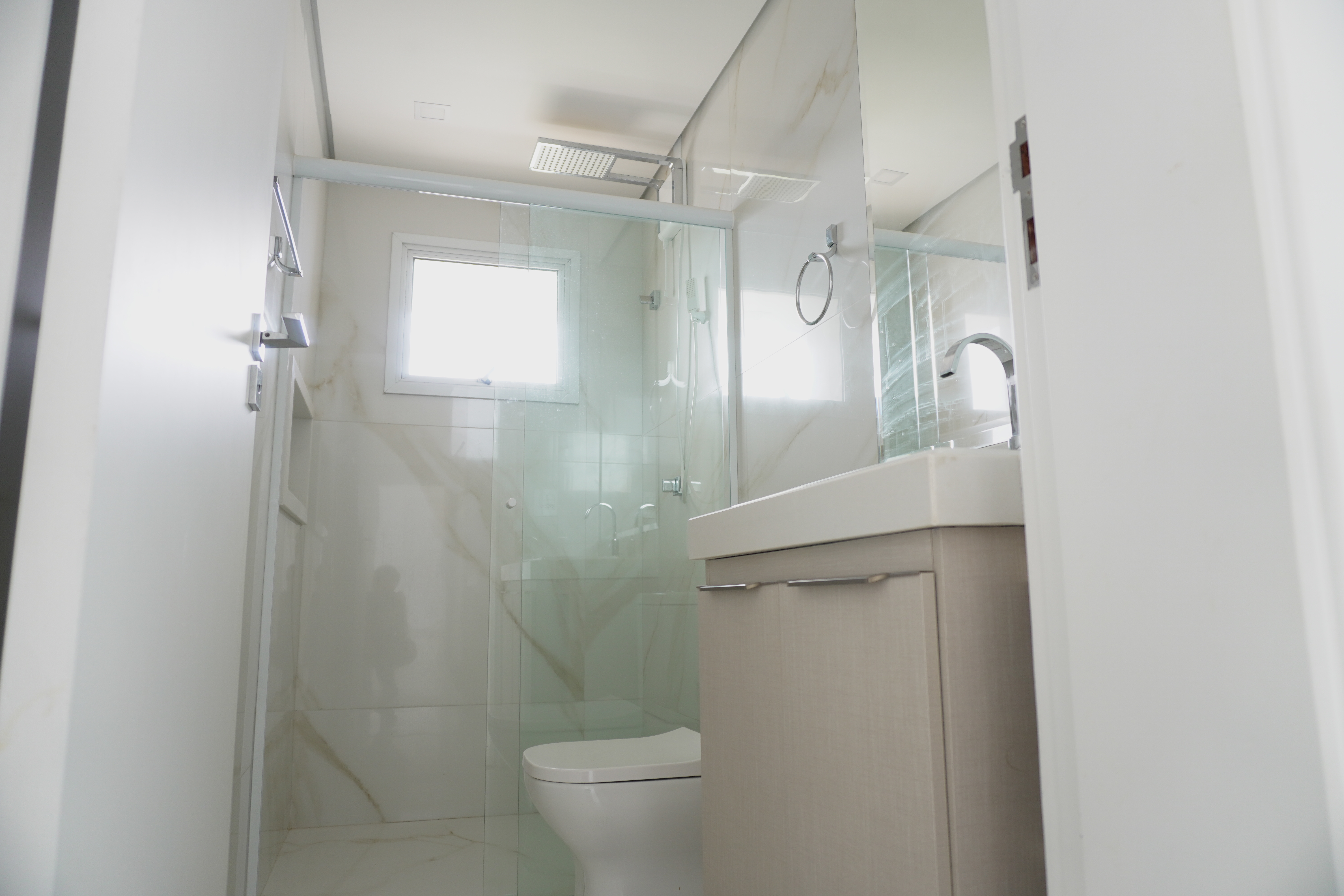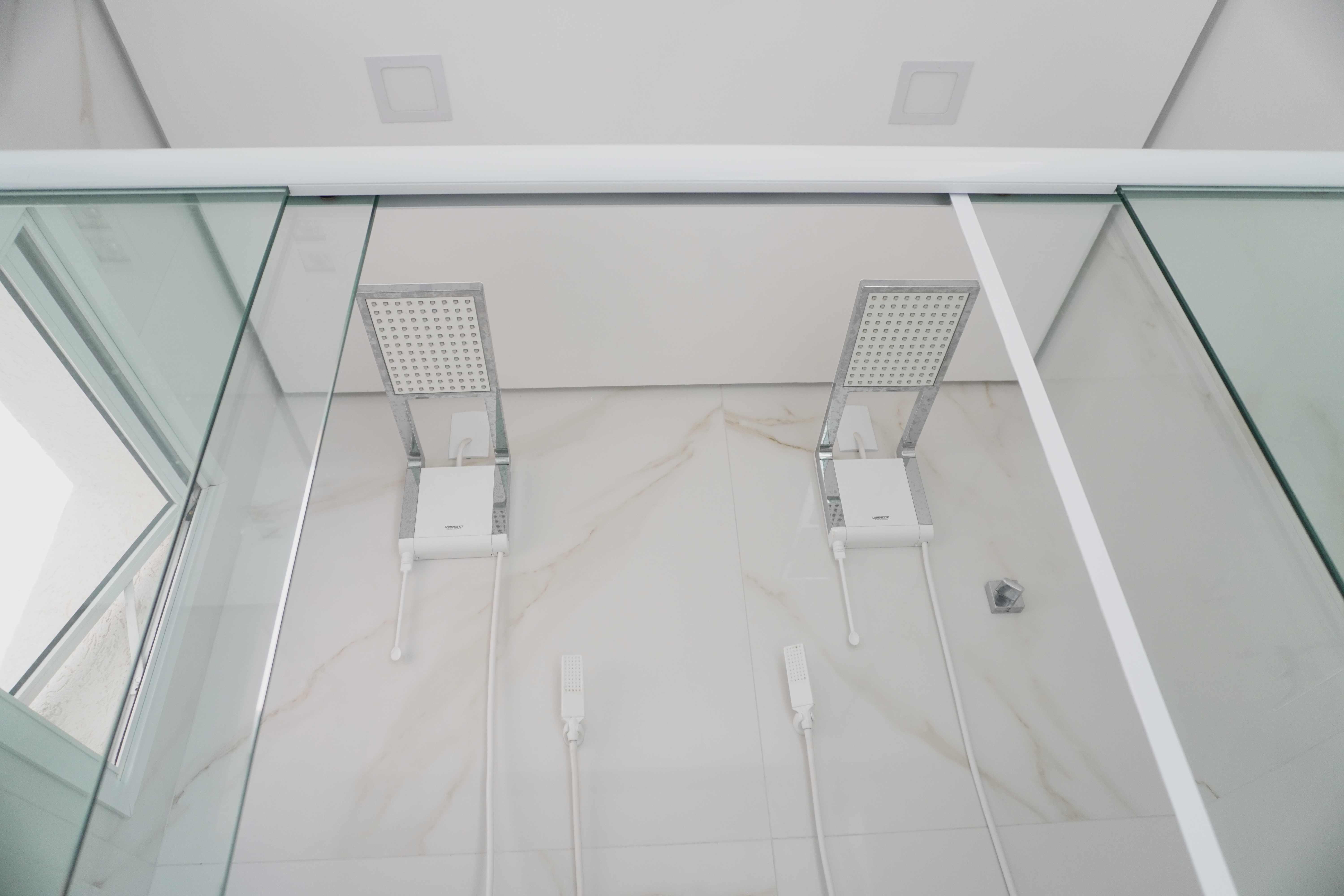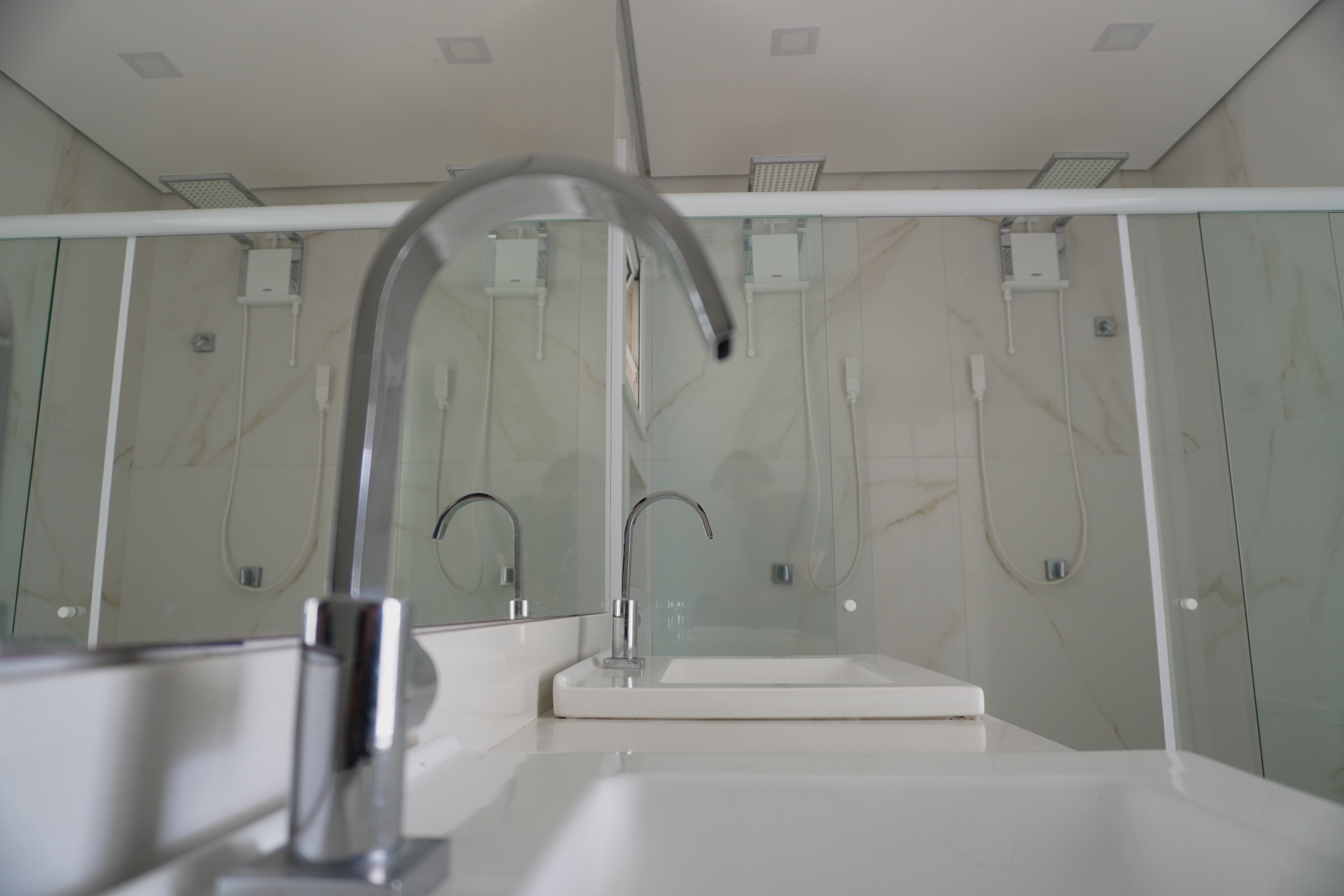 - banheiro da suite com duas cubas Deka, duas duchas Lorenzett Acqua Storm, armários planejados, espelho e luminárias, já instalados;