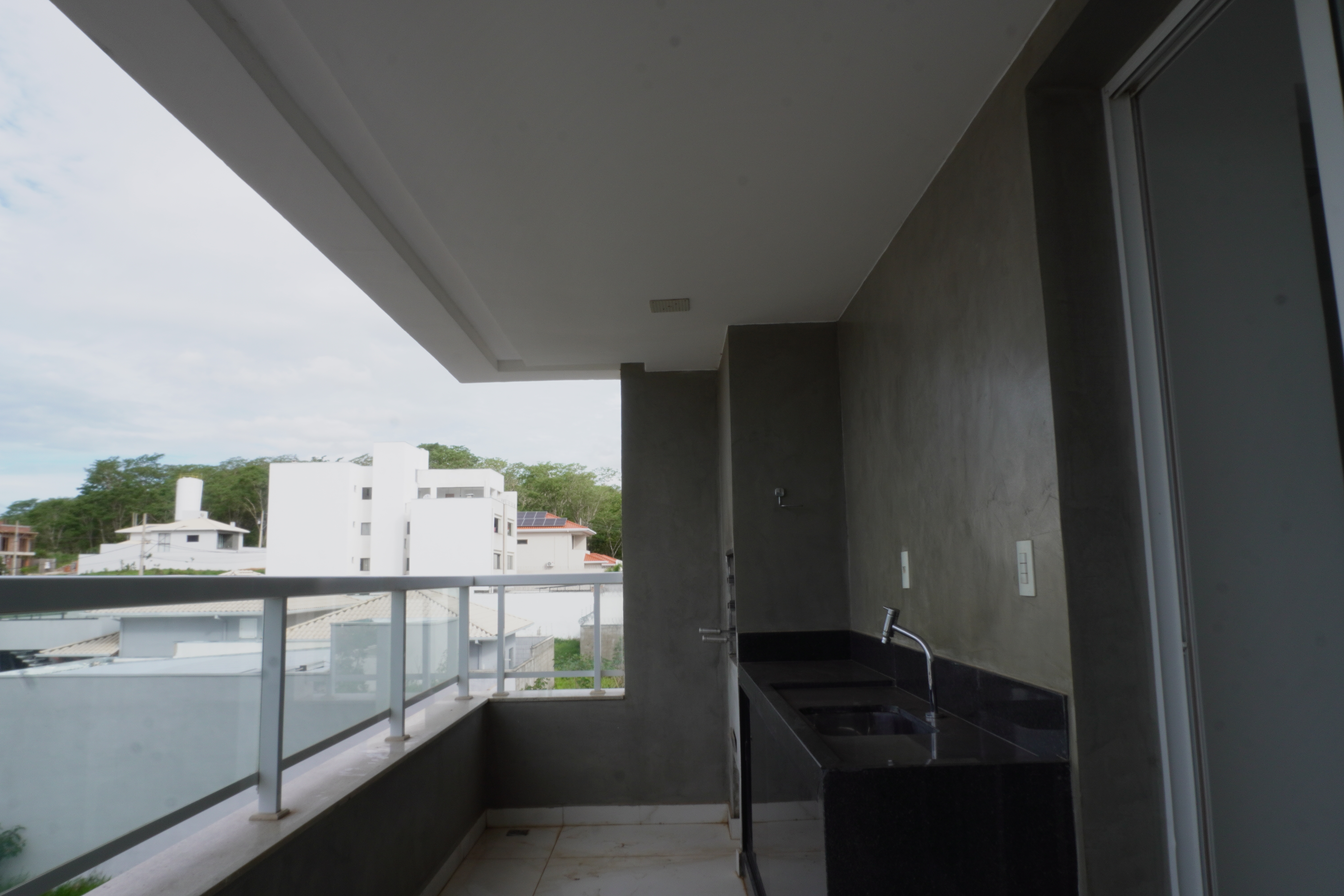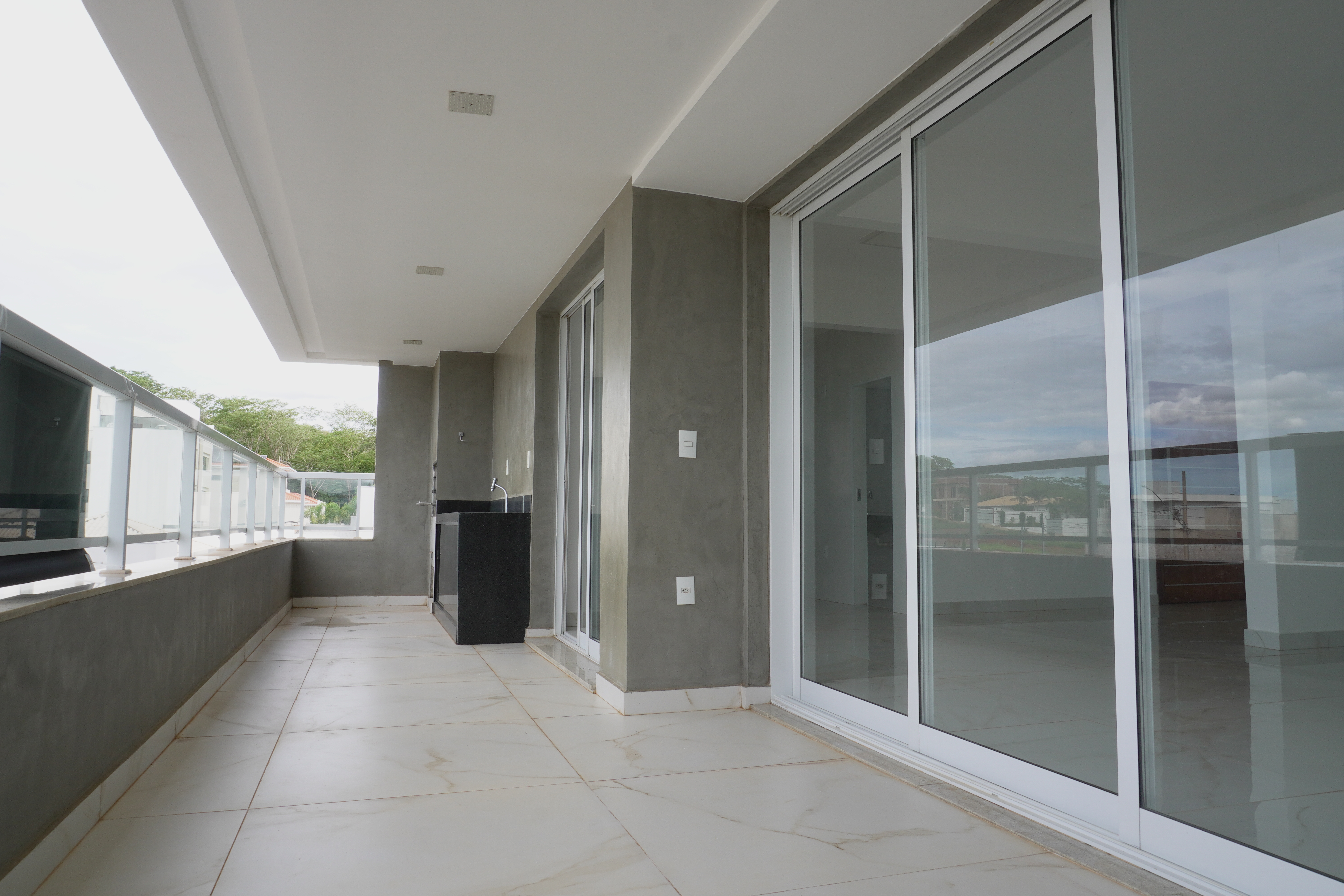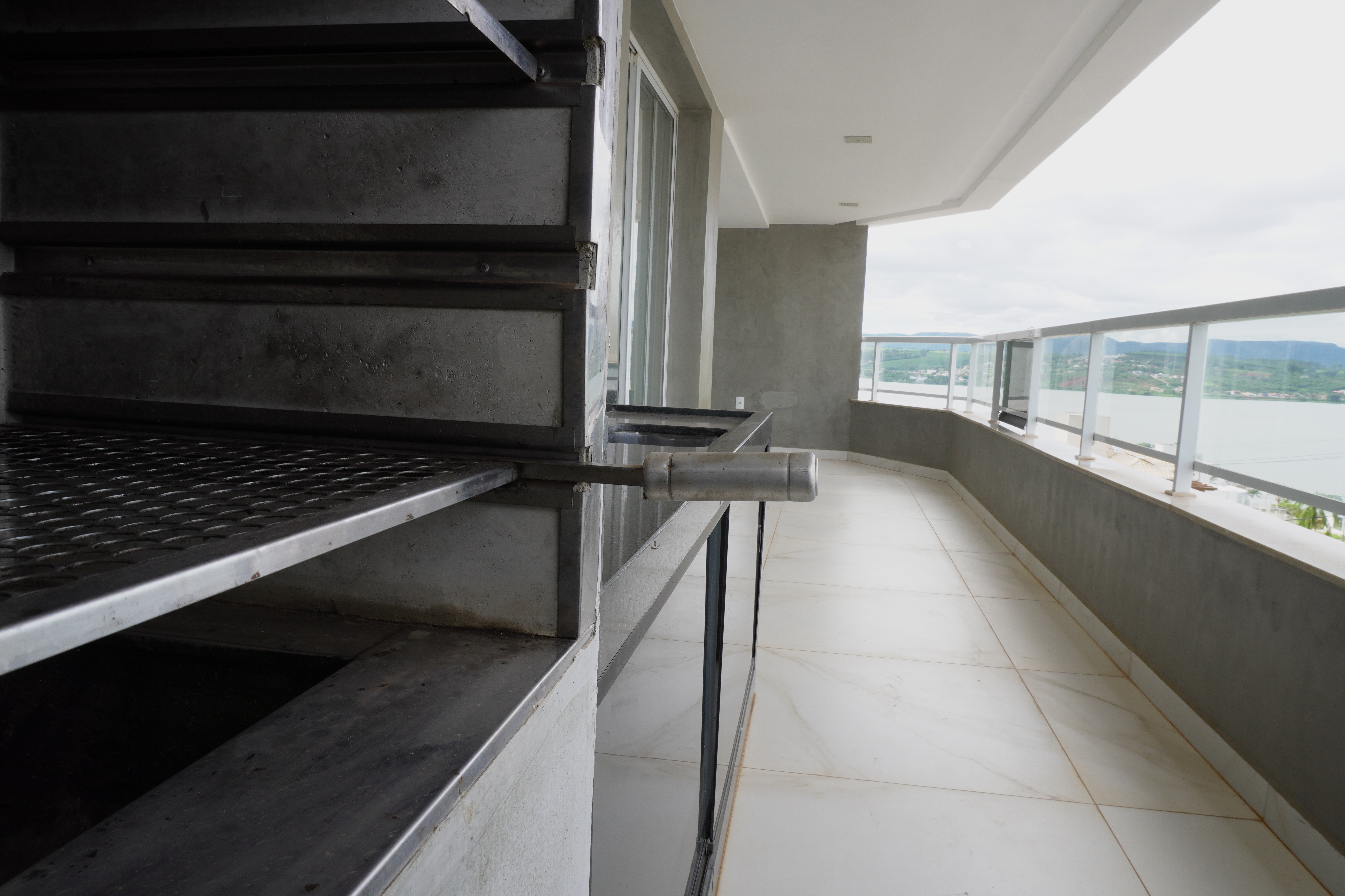 - área gourmet com churrasqueira e com armáros fechados com porta blindex;